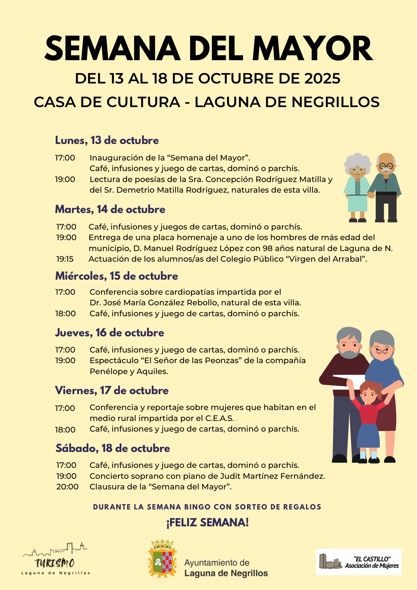 La Semana del Mayor es un evento anual organizado por el Ayuntamiento de Laguna de Negrillos, con la idea de ensalzar la figura de las personas mayores, reconocer su labor, fomentar su participación activa en la sociedad y promover el enriquecimiento personal a través de diversas actividades y actos que tienen lugar a lo largo de una semana en la Casa de Cultura de la localidad.